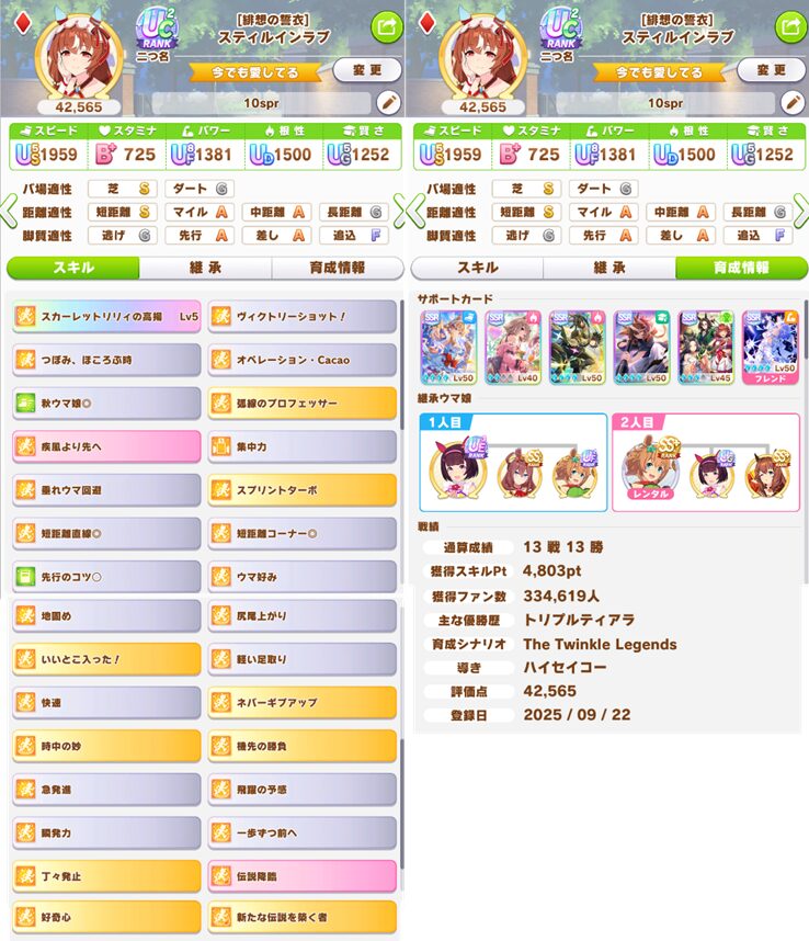 スティルと違い自前スキルを使えるウマの場合は、スキル構成の理論値を出そうと思うと「切れ者厳選」が必須級になると思われます。