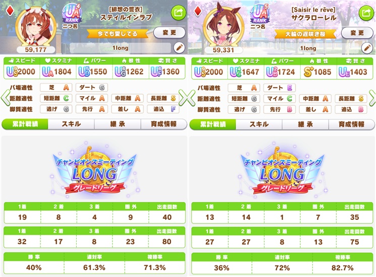 かつて、進化スキル実装~インフレの流れと共に、厩舎の礎を支えてきたドベ&デジのチャンミ引退という経緯を経ての現在がありますので、スティルは進化スキル2種がない仕上がりでありながら、ここまで勝てるとは本当に予想外でした。