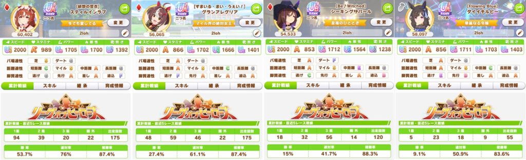・スティルインラブ:6育成目で切れ者を引き、パッと見の仕上がりはなかなかですが、金スキルが完走しておらず、スキル4,5個分がハリボテちゃんです。
